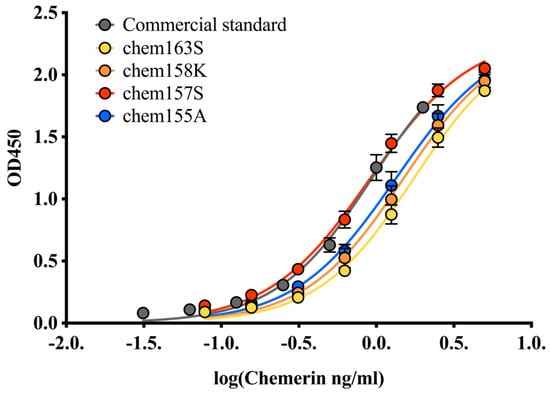 Comparison of the potency of different chemerin forms produced in a mammalian expression system [27] in a commercial ELISA. Standard curves in that commercial ELISA with the E. coli-derived, Glu21–Ser157 chemerin standard provided in the ELISA kit (gray), recombinant chem163S (yellow), recombinant chem158K (orange), recombinant chem157S (red), and recombinant chem155A (blue). Protein concentration for each standard protein was measured by Bradford assay prior to ELISA.