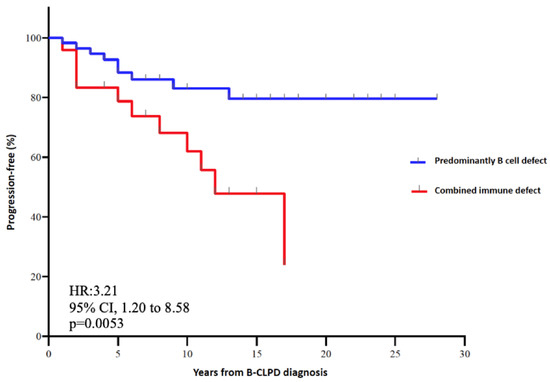 Importantly and not previously reported, patients with combined immune defect showed a 3.67-fold higher risk for cancer progression (95% CI, 1.38–9.72) than predominantly antibody defect (p = 0.014). By Kaplan–Meier estimates, patients with predominantly antibody defect had 80% of progression-free time compared with 20% in patients with combined immune defect phenotype. Combined immune defect showed earlier progression of hematologic cancer with a hazard ratio of 3.21 (95%CI, 1.20 to 8.58) than predominantly antibody defect (p = 0.005) (Figure 2). However, there were no significant differences in mortality rates between both categories (21% with combined immune defect vs. 15% with predominantly antibody defect (p = 0.5). Patients that died in the category of combined immune defect consisted of four patients with a decrease in complement and two patients with CD4+ T lymphocytopenia (<100 cells/µL), suggesting that accumulation of immune defect might impact on the clinical prognosis of B-CLPD patients.