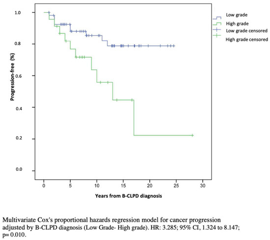 Multivariate Cox’s proportional hazards regression model for cancer progression adjusted by clinical stage (low grade/high grade).