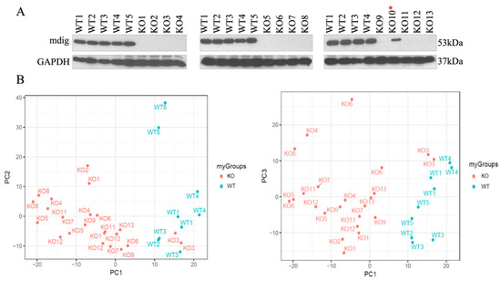 Establishment of mdig knockout cells by CRISPR-Cas9 gene editing. (A), Validation of mdig depletion by CRISPR-Cas9 gene editing through Western blotting for mdig. WT cells represent cells subjected to gene editing but mdig gene remains intact, whereas KO cells represent successful knockout of mdig by gene editing. A total of 5 WT and 13 KO clones are shown. GAPDH was used as a loading control. Asterisks (*) indicates the KO clone containing residual mdig protein. (B), All the WT and KO colonies in duplicates were subjected to proteomics assay. Principal component analysis of the colonies indicated some within group heterogeneity. The colonies were validated and were proceeded for downstream data analysis. KO#10, KO#3, and WT#5 were excluded from further analysis.
