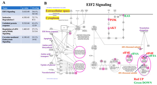 Canonical pathways identified by Ingenuity Pathway Analysis (A), Illustrated are the top five canonical pathways (p < 0.05) based on 904 differentially expressed proteins in the mdig KO vs. WT MDA-MB-231 cells. (B), Canonical pathway analysis revealed the eukaryotic initiation factor 2 signaling pathway among the topmost canonical pathways enriched upon mdig KO. The EIF2 Signaling has been elaborated by showing the upregulated and downregulated proteins and their cellular localization. Nodes represent molecules in a pathway, whereas the biological relationship between nodes is represented by a line (edge). Edges are supported by at least one reference in the Ingenuity Knowledge Base. The intensity of color in a node indicates the degree of up (red) or down (green) regulation.