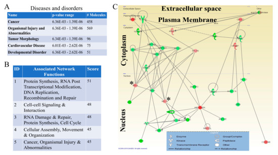 Diseases-associated pathways and protein network in the mdig KO vs. WT MDA-MB-231 cells as analyzed by IPA. (A), Top Diseases and Disorders, depicts the affected functional categories based on differentially expressed proteins where the Name column displays a category of diseases and functions showing Cancer, Organismal Injury and Abnormalities, Tumor Morphology, Cardiovascular Disease and Developmental Disorder as the top diseases in the proteomics dataset, along with the number of molecules associated with the individual diseases and disorder. (B), IPA of protein networks in the MDA-MB-231 KO over WT cells. The top five significant networks as determined by the IPA with their scores and associated functions has been shown. (C), Protein network showing the relationships and connectivity between the focus molecules of the network related to protein synthesis, RNA post transcriptional modification, DNA replication, Recombination and Repair. Red indicated increased and green indicates decreased expression. Star * represents the elevated ribosomal proteins in this pathway.
