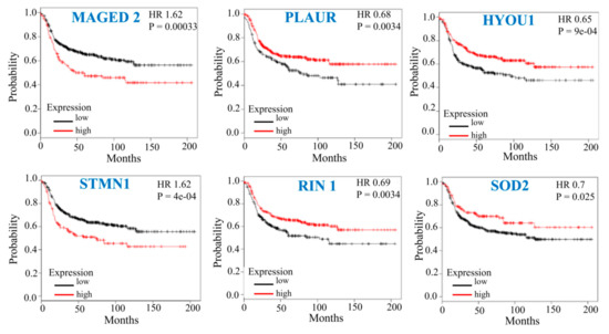 After having established the changes in protein abundance in mdig KO cells, we selected the top upregulated and downregulated proteins following mdig depletion for their clinical implications in human breast cancer. The rationale for selecting these proteins was based on the top-ranked pathways and their specific relevance in the pathogenesis of breast cancer, as indicated in previous reports. The most upregulated proteins in mdig KO cells consisted of MAGED2 and STMN1, while the most downregulated proteins include PLAUR, HYOU1, SOD2, and RIN1. The overall survival (OS) analysis for 618 TNBC patients in the Kaplan–Meier database [50] suggests that high expression of MAGED2 and STMN1 predicted poor OS, whereas increased expression of HYOU1, PLAUR, RIN1, and SOD2 predicted better OS of these patients (Figure 6). The differential regulation of such proteins by mdig is an important finding, where the involvement of these proteins in the regulation of cell proliferation, motility, invasiveness, cancer metabolism, and endoplasmic reticulum stress make them ideal candidates that can be exploited for therapeutic targeting. This also suggests that these proteins are the potential candidate biomarkers that are strongly associated with the tumorigenesis of TNBC or other types of aggressive breast cancers.