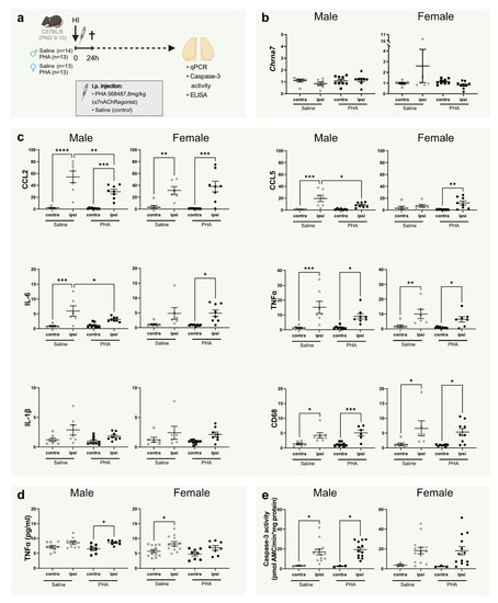 Interestingly, CCL2/MCP-1, CCL5/RANTES and IL-6 gene expression were significantly decreased by PHA treatment 24 h after HI in male mice. Both CCL2/MCP-1 and CCL5/RANTES are upregulated during HI [7] and participate in the recruitment of immune cells into the CNS after injury [47,48,49]. Thus, the decreased expression of CCL2/MCP-1 and CCL5/RANTES indicate a possible effect of α7nAChR stimulation on cell recruitment. However, when investigating the CD68 expression as a marker of peripheral monocytes/macrophages, we did not detect any difference of α7nAChR stimulation. Indeed, CD68 can be expressed by both microglia and peripheral monocytes/macrophages, and it is possible that the 24 h time point is too early for detecting an effect on peripheral involvement.