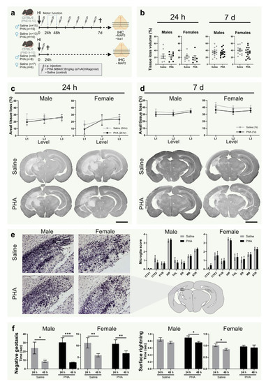 Analysis of mRNA, protein levels and caspase-3 activity were performed in GraphPad Prism (version 9.1.1 for Windows, GraphPad Software, San Diego, CA, USA). Normal distribution was tested using Shapiro-Wilk and statistical test chosen accordingly. The variance homogeneity was examined with Levene’s test. RNA and protein measurements 24 h after HI data were analyzed using one-way ANOVA followed by Sidak’s multiple comparison test. Analysis of tissue loss, microglial activation, animal weights and behavior was performed using SPSS software (IBM SPSS Statistics for Windows, version 26; IBM, Armonk, NY, USA). Measurements of tissue loss, microglial activation, and weights were analyzed with two-way ANOVA with experimental day as nuisance factor. For analysis of behavioral data, negative geotaxis time was compared using Mann-Whitney U test for two independent groups (saline and PHA) for each day (24 and 48 h after HI), and righting direction scores were analyzed with Pearson’s chi-squared test. For analysis of alteration in behavioral data between experimental days (24 and 48 h after HI) within each group, two-tailed paired t-test was used. All graphs were generated using GraphPad Prism (version 9.1.1 for Windows, GraphPad Software, San Diego, CA, USA). The number of mice used per experiment and other specific statistical details are stated in the figure legends. p < 0.05 was considered significant. Graphic illustrations were created using BioRender.com.