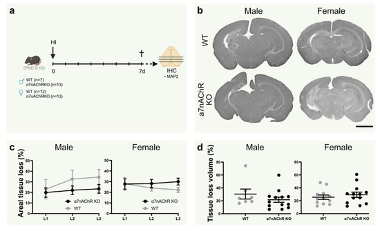 To further elucidate the role of α7nAChR in neonatal brain injury, tissue loss was measured in the brain in α7nAChR knock-outs (KO) and wild-type (WT) littermates following HI (Figure 3a). Knock-out of α7nAChR did not affect tissue loss volume (Figure 3c) or areal tissue loss at individual coronal levels (Figure 3d) in either sex.