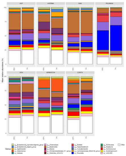 Relative abundance of the genus identified in all the datasets. For each dataset, the mean relative abundance of the 85 genera has been evaluated for ASD patients and HC. The 20 most abundant genera are represented using different colors and the remaining genera are reported in the “Others” bin.