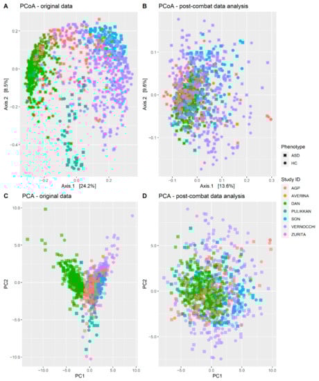 Then, some multivariate data analyses were performed to evaluate how the gut microbiota was influenced by the status (ASD vs. HC) and whether the batch-effect emerged, since all studies were performed using different experimental procedures in different countries. The batch-effect was represented by the variable “Study ID”, which reflects the nationality, the environmental confounders that affect the gut microbiota (such as alimentation and social aspects), and the experimental procedures [53,54]. Methodological and environmental variables cannot be independently considered using the PERMANOVA test because of their collinearity. For this reason, we decided to use the Study ID to simultaneously consider both sources of background noise and take into account the batch effect across all samples.