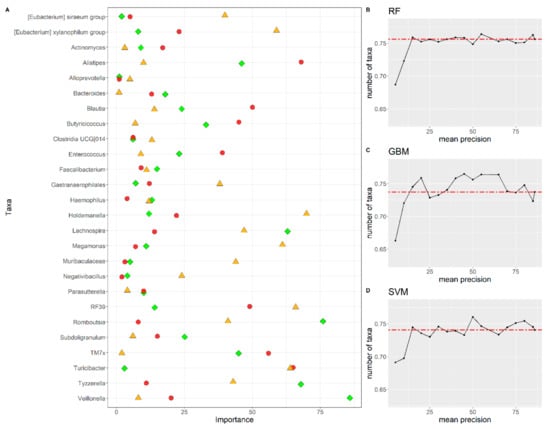 (A) Feature rank importance for all the 15 bacterial taxa identified by the feature selection procedure for the RF (green diamond), GBM (red circle) and SVM (orange triangle) algorithms. Feature selection for the (B) RF, (C) GBM and (D) SVM algorithms. On the y-axis, the mean precision value (evaluated on k = 5 fold) is reported. On the x-axis, the number of the n-th most relevant features used to train the algorithms is reported.