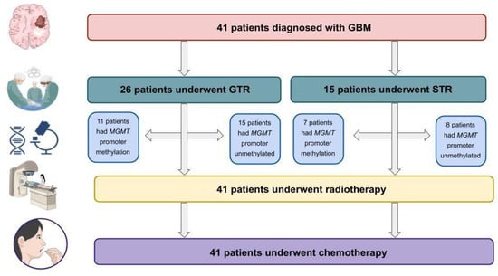 Participants in the study included 41 patients who were newly diagnosed with glioblastoma and were treated at the 10th Military Research Hospital and Polyclinic in Bydgoszcz, Poland, between the years 2011 and 2014. All of the patients received surgical resection, which was then followed by radiation treatment and chemotherapy with alkylating drugs. The flow chart of the study is presented in Figure 1. The characteristics of the group being studied are detailed in Table 1.