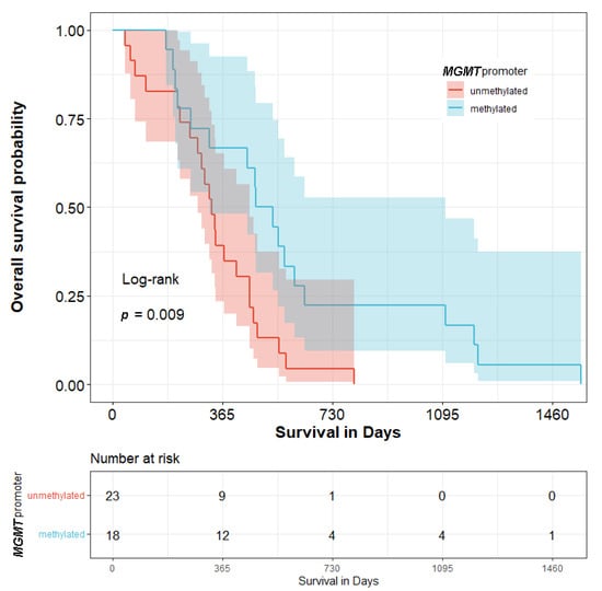 A significant difference between the MGMT-methylated and unmethylated groups in terms of median OS is demonstrated in Figure 2 (504 days vs. 329 days) (p < 0.05).