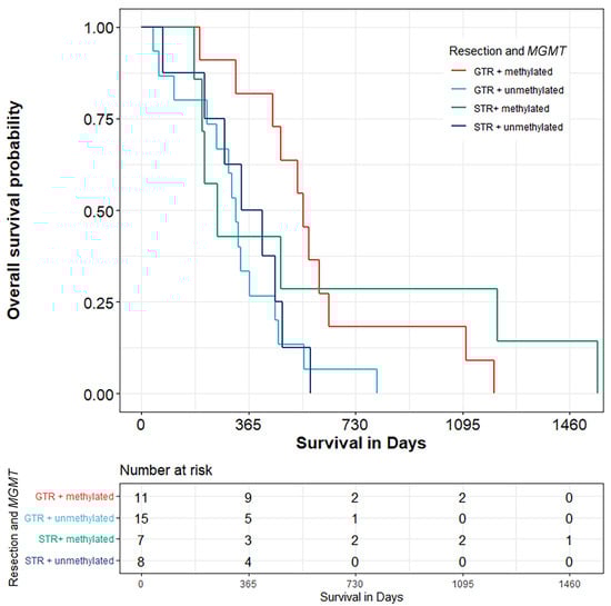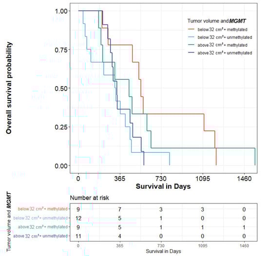 Patients in our study underwent surgical resection followed by combined radiotherapy and adjuvant temozolomide therapy, because the benefits of this kind of therapy last for five years [20]. Our study presented evidence that patients with baseline tumor volume ≤32 cm3 who had MGMT methylation lived significantly longer (median 560.5 days vs. 329 days without methylation). This can be attributed to more radical resection of the smaller tumors in contrast with tumors with a larger volume. In contrast, Wood et al. demonstrated that tumor size in high-grade glioma did not influence prognosis [34]. Several studies did not show a strong correlation between preoperative imaging of tumor size and OS, although the extent of resection was important [35,36].
