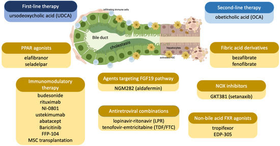 Ursodeoxycholic acid (UDCA) is the first-line therapy used for the treatment of PBC. In recent years, new pharmacological agents have been proposed for PBC therapy to cure UDCA-non-responders. Obeticholic acid (OCA) is registered in many countries for PBC, and fibrates also seem to be effective in ameliorating biochemistry alteration and symptoms typical of PBC. Moreover, a variety of new agents, acting with different mechanisms of action, are under clinical evaluation for PBC treatment, including PPAR agonists, anti-NOX agents, immunomodulators, and mesenchymal stem cell transplantation. Since an insufficient amount of data is currently available about the effect of these novel approaches on robust clinical endpoints, such as transplant-free survival, their clinical approval needs to be supported by the consistent improvement of these parameters. The intensive research in this field will hopefully lead to a novel treatment landscape for PBC in the near future, with innovative therapies based on the combination of multiple agents acting on different pathogenetic mechanisms.