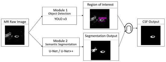 Therefore, we used YOLO v3 as our object detection module. After Redmon et al. first introduced the YOLO algorithm, it drew wide attention because of its speed and accuracy []. Since then, YOLO has been widely used in various applications and subsequently evolved advanced versions. YOLO v2 improved the inaccurate positions and low recall rate of YOLO. Compared with YOLO v2, YOLO v3 provides multi-scale features. YOLO v4 was developed for small object detection []. Since the size of CSF lies in a certain range, we did not have the problem of detecting troublesome small objects and chose the YOLO v3 for the current study. One disadvantage of the proposed models is that the object detection module (YOLO v3) and the semantic segmentation module (U-net or U-net++) are trained separately. However, the disadvantage of dual modules carries one major strength. In the field of image processing, object detection and semantic segmentation are two critical topics. In this paper, we integrated two tasks mentioned above into one system in the form of two individual modules. Instead of combining those two tasks into one single model, the proposed dual-module architecture provides the flexibility of choosing the proper algorithms and of fine-tuning mechanisms to individually improve the performance of object detection and semantic segmentation.