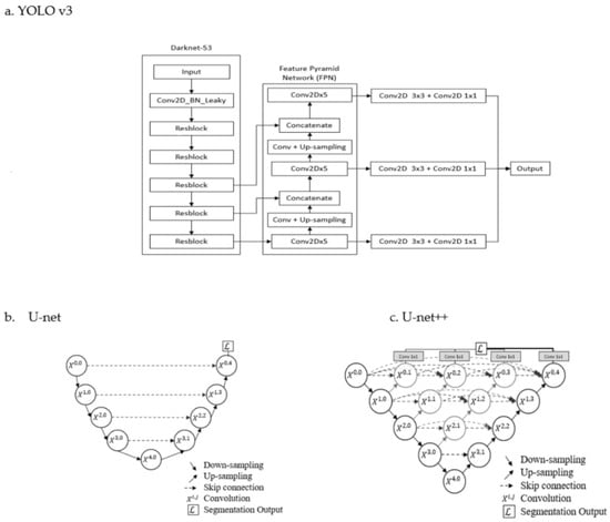 Architectures of YOLO v3 (a), U-net (b), and U-net++ (c) [,,,].