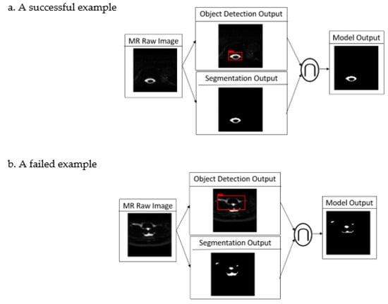 U-net and the variants are widely used in medical image data, for example, segmentation of brain tumor and tissue, stroke lesion, cardiovascular structure, spinal cord, and various types of cancer in recent years []. In our study, IoU values of U-net and U-net++ were good for spinal CSF segmentation, but the performance was better for combing object detection and semantic segmentation. Jaeger et al. developed Retina U-Net, fusing the Retina Net one-stage detector with the U-net architecture to detect and segment lung lesions in CT images and breast lesions in diffusion MR images []. Compared with U-net providing the function of semantic segmentation only, Retina U-Net provides both object detection and semantic segmentation. Our preliminary study applied both U-net and Retina U-Net to quantify spinal CSF in MRM images, and the experimental results showed that the Retina U-Net provided a lower segmentation performance than U-net []. This means that Retina U-Net offers the object detection function by sacrificing semantic segmentation performance.
