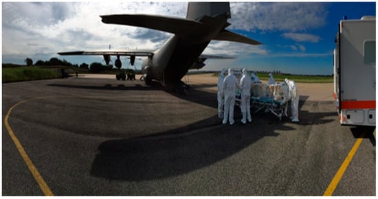 - Dagens, A.B.; Mckinnon, J.; Simpson, R.; Calvert, C.; Keast, T.; Hart, N.; Almond, M. Trans-Atlantic aeromedical repatriation of multiple COVID-19 patients: A hybrid military-civilian model. BMJ Mil. Health 2020. [Google Scholar] [CrossRef]