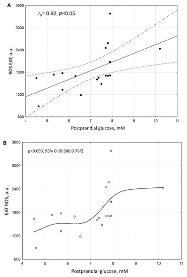 Variables EAT ROS and postprandial glucose had a distribution close to normal (according to the Shapiro–Wilk test p = 0.057 and p = 0.078, respectively), with the relationship between EAT ROS and postprandial glucose being the closest to linear. However, the possibility to create a simple linear regression model of postprandial glucose on EAT ROS was limited due to the high heteroscedasticity of the sample data and the small sample size (n = 19). The empirical correlation ratio of the degree of strength of the relationship between ROS EAT and postprandial glucose was ρ = 0.693, 95% CI (0.586; 0.767) (Figure 2B).