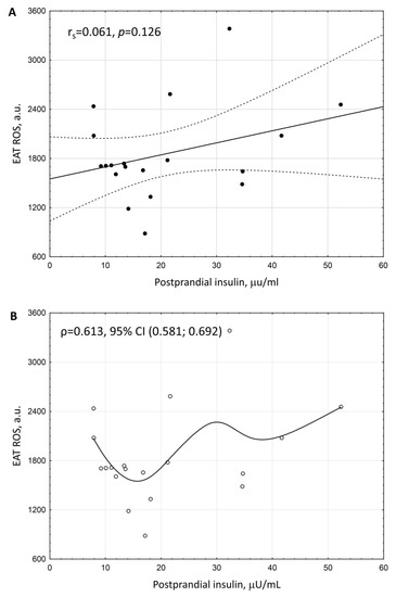 Even though we did not reveal the statistically significant linear relationship between EAT ROS increase with elevated postprandial insulin (Figure 3A), clinical considerations prompted us to explore the presence and form of relationship between EAT ROS and postprandial insulin level. The relationship between these variables appeared to be highly nonlinear and was approximated by a third-degree polynomial (Figure 3B). The correlation ratio of the degree of the relationship strength between ROS EAT and postprandial insulin constituted ρ = 0.613, 95% CI (0.581; 0.692) (Figure 3B).