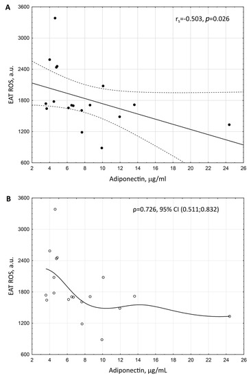Scattering diagram of ROS production by EAT adipocytes and the serum level of adiponectin in patients with coronary artery disease and coronary atherosclerosis. (A)—Spearman correlation coefficient (rs). (B)—empirical regression line. Adiponectin level was adjusted to BMI.