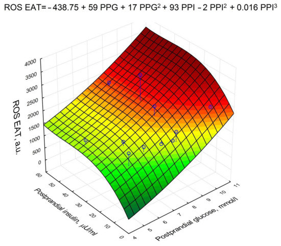 A non-linear multivariate regression analysis was performed, which revealed that postprandial glycemia and postprandial insulinemia positively affected the production of ROS EAT in a complex way (Figure 5).