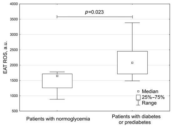 The ROS production by EAT adipocytes was significantly higher in patients with diabetes and prediabetes than in patients with normoglycemia (p = 0.023) (Figure 6).