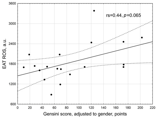 We did not find a significant linear relationship between ROS EAT and the severity of atherosclerosis as assessed by the Gensini score (rs = 0.44, p = 0.065) (Figure 7).