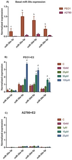 3.1. MiR-30 Family Members Are Overexpressed in the ERα Expressing PEO1 Ovarian Cells and Their Expression Responded to Estrogen Treatment