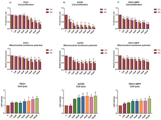 Study the effect of high-dose E2 exposure to the cell proliferation, apoptosis and cell lysis of the PEO1 and A2780 cell cultures. Phenotypic characterization of high-dose E2 treatment was made in the PEO1 (A) and A2780 (B) cell lines as well as in the PEO1 cell line in the presence of 10 nM MPP (C). The rate of cell proliferation, mitochondrial membrane potential (24 h and 48 h after the treatment), and LDH activities (48 h after the treatment) were determined relative to the non-treated control (1). The data are presented as the mean ± S.D. a: p < 0.05; b: p < 0.01; c: p < 0.001; d: p < 0.0001.