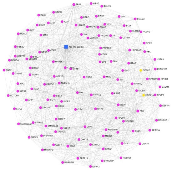 Functional annotation analysis of the targets of miR-30d-5p. Gene–gene and protein–protein interactions of the targets of miR-30d-5p were generated by the miRNet tool.