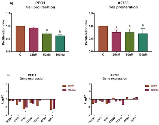 MiR-30d-5p was chosen for further analysis on the grounds of the following results: (i) it showed high basal expression in PEO1 and responded well to high-dose E2 treatment where intensive cell death was observed, (ii) the functional annotation of miR-30d-5p targets resulted in several pathways that were involved in the regulation of cell cycle and cell death, and (iii) the application of miR-30d-5p mimic reduced cell proliferation and induced cell death in several cancer cell lines according to previous studies [28,33,34,35]. Based on these observations, we aimed to characterize the impact of miR-30d-5p in human ovarian cells by transfecting the PEO1 and A2780 cells with miR-30d-5p mimic. Successful transfection was confirmed by qPCR that showed a significant increase in miR-30d-5p level in the transfected cells (Log2FC values were 8.56 and 8.65 after transfection with 50 or 100 nM mimic compared to the non-transfected control in PEO1; and 6.69 and 8.52 in A2780). According to our results, the miR-30d-5p mimic significantly suppressed cell proliferation in both cell lines in a dose-dependent manner (Figure 5A), while cell proliferation was not affected significantly when the cells were transfected with the negative control in the same doses (Supplementary Figure S4). Gene expression studies revealed that the expression of TP53 and SOX4 was significantly decreased in the transfected PEO1 cells, which is in good agreement with the fact that these genes are considered to be targeted by miR-30d-5p [28,36]. The expression of the additional genes that were tested was not altered significantly (Figure 5B).