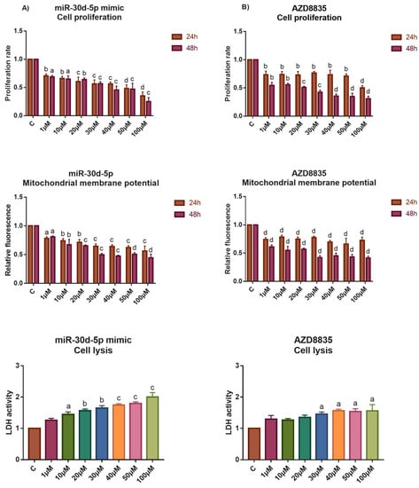 Study the effect of high-dose E2 exposure to the cell proliferation, apoptosis and cell lysis of the PEO1 cell cultures in the presence of miR-30d-5p mimic or AZD8835. Phenotypic characterization of high-dose E2 treatment was made in the PEO1 cell line in the presence of 50 nM miR-30d-5p mimic (A) or 100 nM AZD8835 (B). The rate of cell proliferation, mitochondrial membrane potential (24 h and 48 h after the treatment), and LDH activities (48 h after the treatment) were determined relative to the non-treated control (1). Data are presented as the mean ± S.D. a: p < 0.05; b: p < 0.01; c: p < 0.001; d: p < 0.0001.