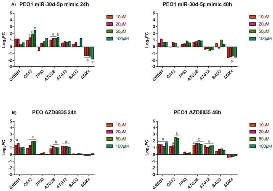 Study the effect of high-dose E2 exposure on gene expression in the presence of miR-30d-5p mimic or AZD8835. Log2FC values of selected genes were determined in response to E2 treatment in the PEO1 cell line in the presence of 50 nM miR-30d-5p mimic (A) or 100 nM AZD8835 (B). Total RNA was isolated from the cells at 24 h and 48 h after E2 treatment. Significance was determined between the ∆CT values of the treated and non-treated samples. a: p < 0.05; b: p < 0.01; c: p < 0.001.