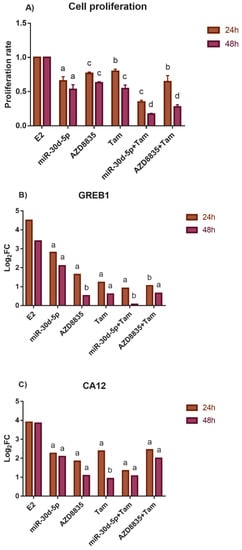 In the end of our work, we studied whether the application of the miR-30d-5p mimic decreased the tamoxifen sensitivity (that acts as an anti-estrogen) of PEO1 due to the following reasons: (i) a close interaction is suggested between the PI3K pathway and ER signaling in our study that was also supported previously in breast cancer [40], (ii) the concurrent inhibition of both PI3K and ER signaling proved to have synergistic effect and is considered to be a promising strategy in the therapy of breast cancer [40,41], and (iii) tamoxifen is considered to be a therapeutic option in ER+ ovarian cancer [42]. These experiments were carried out in the presence of 10 nM E2, which is considered to be a physiologically relevant E2 dose, and successfully induced proliferation as well as an ERα-mediated estrogen response previously [18]. According to our results, miR-30d-5p, AZD8835, as well as tamoxifen successfully inhibited the proliferative effect of 10 nM E2 that was in good agreement with the reduced induction of GREB1 and CA12 expression (Figure 8). Furthermore, the combination of tamoxifen with either miR-30d-5p or AZD8835 resulted in a more significant inhibition of cell proliferation (Figure 8A).