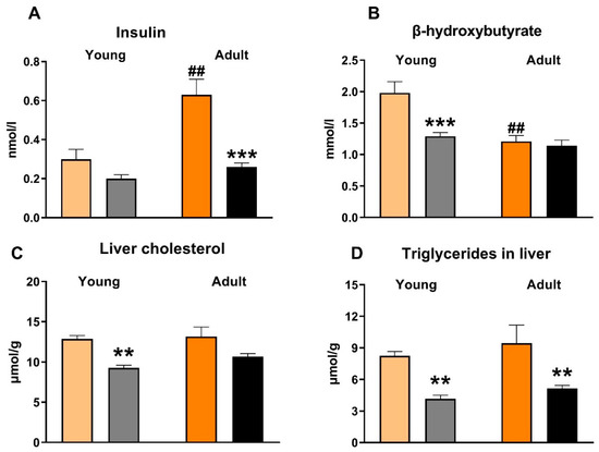 The effect of empagliflozin treatment on plasma insulin (A), plasma β-hydroxybutyrate (B), liver cholesterol (C) and liver triglycerides (D). p < 0.05 empagliflozin vs. untreated group, p < 0.05 vs. respective young group. ## denotes p < 0.01, ** denotes p < 0.01; *** denotes p < 0.001; Data are means ± SEM; n = 7–8 for each group.