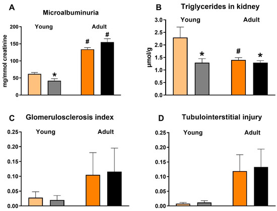 The effect of empagliflozin treatment on microalbuminuria (A), triglycerides in kidney (B), glomerulosclerosis index (C) and tubulointerstitial injury (D). * p < 0.05 empagliflozin vs. untreated group, # p < 0.05 vs. respective young group. Data are means ± SEM; n = 7–8 for each group.