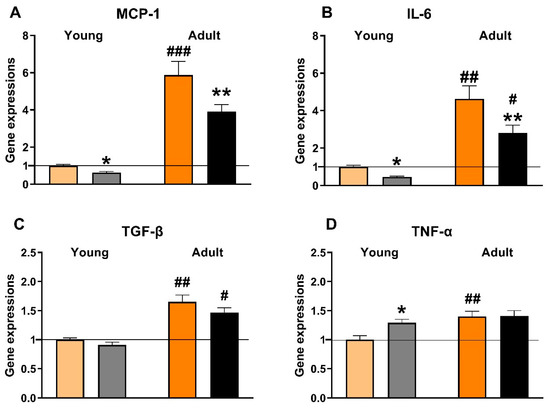 Relative mRNA expression of selected pro-inflammatory genes in the kidneys—monocyte chemoattractant protein-1 (MCP-1; (A)), Interleukin-6 (IL-6; (B)), Transforming growth factor-β (TGF-β; (C)), and Tumor necrosis factor-α (TNF-α; (D)). # p < 0.05 vs. respective young group. * denotes p < 0.05; ** denotes p < 0.01; ## denotes p < 0.01; ### denotes p < 0.001. Data are means ± SEM; n = 7–8 for each group.