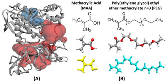 (A) Structure of the MMP9 protein extracted from PDB; the ribbon representation of the protein secondary structure is combined with a visualization of the two most significant pockets identified by the CASTp web program [45]. These are the catalytic domain (blue spheres) and the central region of the protein between the catalytic + propeptide domain and the FnII domains; (B) structures of the MAA and PEG monomers.