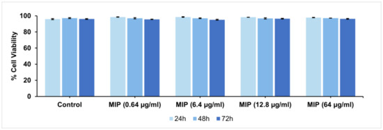 Finally, the biocompatibility of the produced MIPs is of fundamental importance for in vivo applications. Cytocompatibility analyses were performed on MIPs over a wide range of doses using the Propidium Iodide Flow Cytometry assay and H9C2 cardiomyoblasts, a valuable in vitro model for cardiac disease studies. Specifically, extracts of MIPs at three different concentrations were added to H9C2 cells, and the viability after 24, 48, and 72 h of exposure was evaluated (Figure 7). The results indicated optimal cell viability at all doses tested and for all three evaluation time-points.