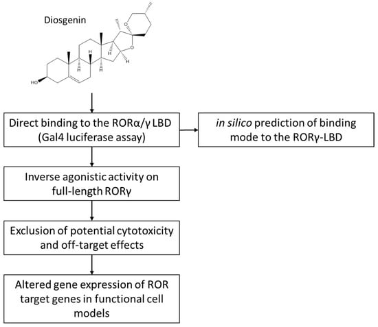 Graphical scheme of the study approach. First, the direct binding of diosgenin to the RORγ (and subsequently the RORα) LBD was examined using RORα/γ-Gal4 luciferase assays. The inverse agonistic activity elucidated via the Gal4 assays was subsequently confirmed using full-length RORγ luciferase assays. Then, cytotoxicity and potential off-target effects were excluded using resazurin and nuclear receptor-Gal4 assays, respectively. Finally, changes in target gene expression of RORγ target genes in functional cellular models were studied. In silico prediction of diosgenin’s binding mode was performed by employing molecular docking.