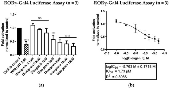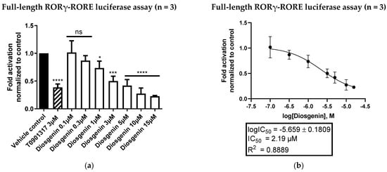 RORγ-Gal4 luciferase assay of diosgenin in HEK293 cells. (a) Diosgenin was tested at different concentrations in a cell-based RORγ-Gal4 luciferase assay to determine its inverse agonistic activity on RORγ. The luminescence signals derived from the luciferase reporter were normalized to eGFP fluorescence and expressed as fold activation normalized to the vehicle control (0.096% EtOH). The described RORα/γ inverse agonist T0901317 (3 µM) was used as a positive control. Bar charts represent transactivation activities expressed as mean ± SD of three biological replicates (n = 3) measured in technical quadruplicates. One-way ANOVA followed by Dunnett’s post hoc test were used for statistical analysis. **** p ≤ 0.0001, *** p ≤ 0.001, ns p > 0.05 compared to vehicle control. (b) Fitted concentration–response curve of the inverse agonistic activity of diosgenin on RORγ-Gal4 with a determined IC50 value of 1.73 µM. The curve was fitted by nonlinear regression using a standard Hill coefficient of −1.0. Data are presented as means ± SD of three biological replicates (n = 3) measured in technical quadruplicates.