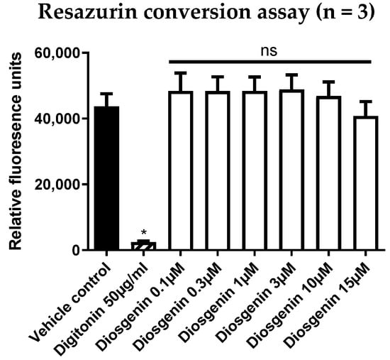 To further exclude potential cytotoxicity of diosgenin in these two cell lines, resazurin conversion assays were performed and no significant reductions in cell viability could be detected up to a concentration of 15 µM (Figure S3).