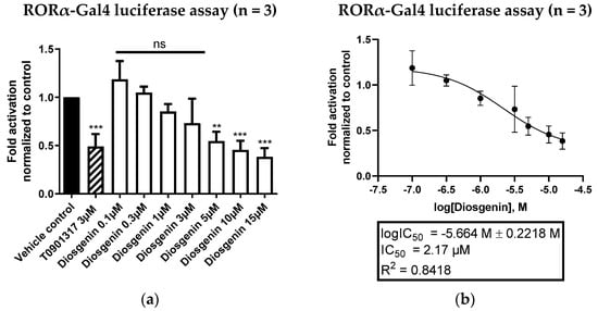 RORα-Gal4 luciferase assay of diosgenin in HEK293 cells. (a) Diosgenin was tested at different concentrations in a cell-based RORα-Gal4 luciferase assay to determine its inverse agonistic activity on RORα. The luminescence signals derived from the luciferase reporter were normalized to eGFP fluorescence and expressed as fold activation normalized to the vehicle control (0.096% EtOH). The described RORα/γ inverse agonist T0901317 (3 µM) was used as a positive control. Bar charts represent transactivation activities expressed as mean ± SD of three biological replicates (n = 3) measured in technical quadruplicates. One-way ANOVA followed by Dunnett’s post hoc test were used for statistical analysis. *** p ≤ 0.001, ** p ≤ 0.01, ns p > 0.05 compared to vehicle control. (b) Fitted concentration–response curve of the inverse agonistic activity of diosgenin on RORα-Gal4 with a determined IC50 value of 2.17 µM. The curve was fitted by nonlinear regression using a standard Hill coefficient of −1.0. Data are presented as means ± SD of three biological replicates (n = 3) measured in technical quadruplicates.