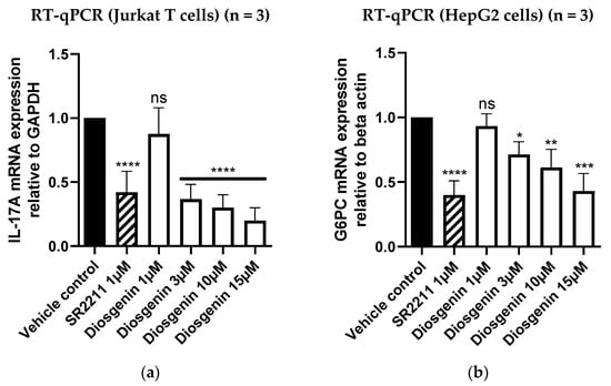 In additional experiments, we could confirm that diosgenin was also able to downregulate the expression of the RORα/γ target genes IL-17A and glucose-6-phosphatase (G6PC) in suitable cellular models, further highlighting the functional consequences of the ROR inverse agonism. However, a potential limitation of these findings is the lack of confirmation on protein levels in this study, although other studies could already confirm such effects of diosgenin on protein levels for IL-17 in other cell models [,]. Moreover, alterations in mRNA expression levels represent the closest functional consequence of compounds acting as nuclear receptor modulators detectable within cells. Nevertheless, further confirmations of these effects on protein levels are needed and should be addressed in follow-up studies.