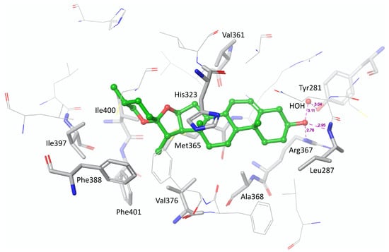 The likely binding mode of diosgenin in the RORγ-LBD was derived by in silico docking with GOLD []. A total of ten docking poses were generated. All generated poses are consistent with respect to the location and orientation of the ligand, and the docking scores indicate a good geometric match of the predicted poses and the ligand-binding site (ChemPLP scores between 76.671 and 76.858). The docking poses indicate that the binding of diosgenin is likely driven by hydrophobic interactions with multiple residues forming the ligand-binding site, including Leu287, His323, Val361, Met365, Ala368, Val376, Phe388, Ile397, Ile400 and Phe401. The hydroxy moiety in position 3 of diosgenin is predicted to act as the key anchoring group by forming hydrogen bond interactions with Leu287, Arg367 and, via a water molecule, with Tyr281 (Figure 9).