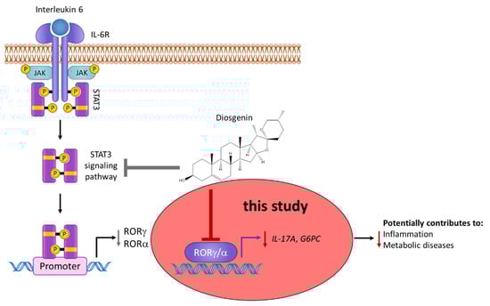 Overview on the updated pharmacological actions of diosgenin. Besides the already described effect of diosgenin on the expression and phosphorylation levels of STAT3 [], this study now extends the activity profile of diosgenin to a direct and dual-specific modulation of the nuclear receptors RORα and RORγ (highlighted in red). The observed inverse agonistic activity on RORα/γ was further shown to significantly decrease the expression levels of the important ROR target genes IL-17A and G6PC, which are directly involved in the pathogenesis of Th17-driven inflammatory processes and metabolic processes and thereby potentially contribute to the beneficial effects of diosgenin observed in these conditions [].
