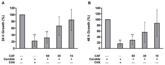 Microdilution test for caffeine (CAF) effects against C. albicans growth showing the percentage (%) growth calculated from the measured optical density (OD) of different groups measured at 620 nm. (A) After 24 h incubation at 37 °C with broth media. (B) After 48 h incubation at 37 °C with broth media. Data are expressed as mean ± SD (n = 6) and statistically analyzed using one-way ANOVA followed by Tukey’s post hoc test. The significance was considered when ** p ≤ 0.01 as compared with control.