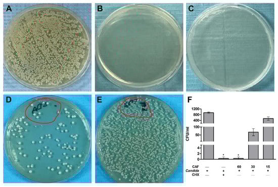 Antifungal Susceptibility Assay of caffeine (CAF) against C. albicans growth. (A) Fungal cell overgrowth in control group (PBS) containing no treatments. (B) Complete inhibition of the fungal cell growth in chlorhexidine (CHX) group. (C–E) Different concentrations of CAF including 60, 30, and 15 mg/mL, respectively, showing the dose-dependent effects of CAF and the gradual growth inhibition of fungal cells. (F) CFU count of different SDA plates. Data are expressed as mean ± SD (n = 3) and statistically analyzed using Kruskal–Wallis test and Dunn’s post hoc test. The significance was considered when * p ≤ 0.05 as compared with control.