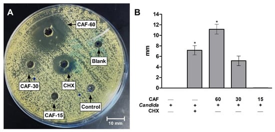 Agar-well diffusion method for caffeine (CAF) effects against C. albicans growth. (A) Different concentrations of CAF including 15 mg/mL, 30 mg/mL, and 60 mg/mL were tested. The higher two concentrations of CAF (30 and 60 mg/mL) showed the most prominent inhibition of the fungal growth as compared with control containing PBS alone, blank containing distilled water, and standard therapy containing chlorhexidine (CHX). (B) Measurements of zone of inhibition (mm). Data are expressed as mean ± SD (n = 3) and statistically analyzed using Kruskal–Wallis test and Dunn’s post hoc test. The significance was considered when * p ≤ 0.05 as compared with control.