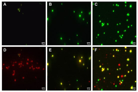 Live/Dead yeast viability method for caffeine (CAF) effects against C. albicans growth. The highest concentration of CAF (60 mg/mL) was tested. (A–C) Image showing dead fungal cells stained in green without treatments (A), with CHX treatment (C), and with CAF (60 mg/mL) treatment. (D–F) Image showing merged dead/live fungal cells stained in yellow-green or red-orange, respectively, after no treatments (D), after treatment with CHX (E), and after treatment with CAF (60 mg/mL) (F). Full plasma membrane integrity and metabolic function of yeast are needed to convert the yellow-green fluorescent into red-orange color.